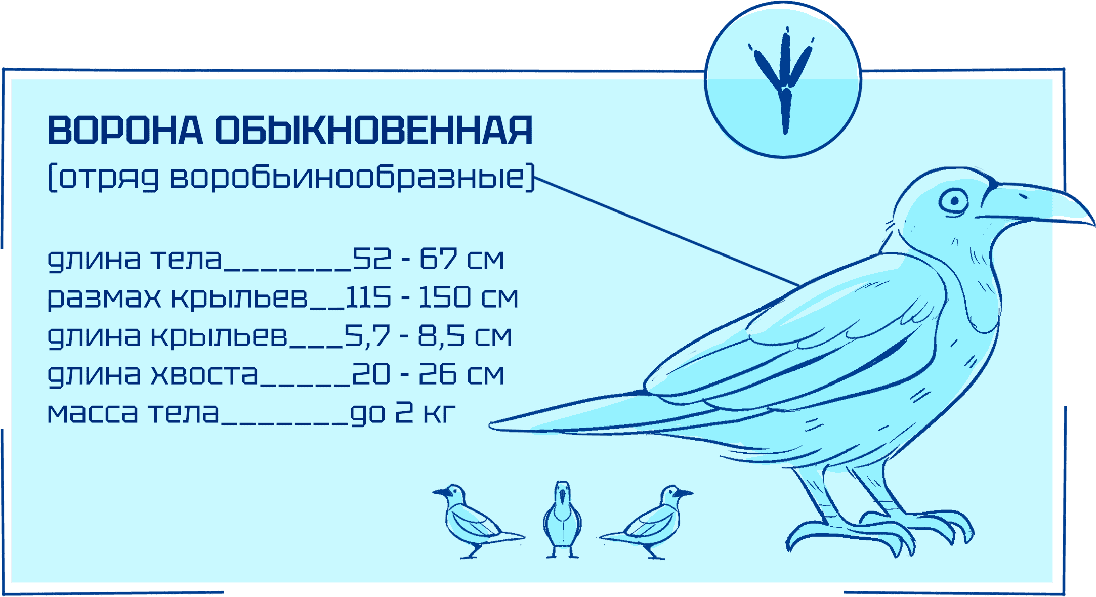 – Ворона обыкновенная – крупная птица с блестящим чёрным оперением, лапы и клюв также чёрные. Длина тела взрослой особи достигает 52–67 сантиметров. Размах крыльев – от 115 до 150 сантиметров. Клюв большой и слегка изогнутый, длиной от 5,7 до 8,5 сантиметра. Длина хвоста – от 20 до 26 сантиметров. Масса тела – до 2 килограммов, что делает во́рона обыкновенного одним из крупнейших представителей отряда воробьинообразных.