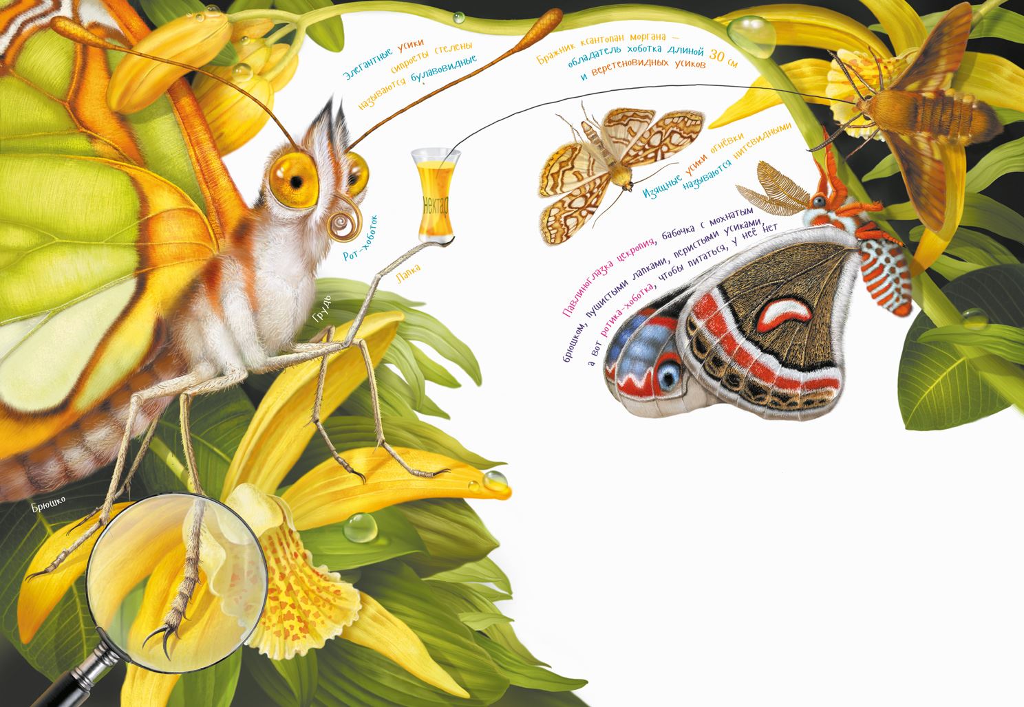 Гляжусь на себя в зеркало и не могу налюбоваться! Мой скелет не внутри, а снаружи, словно доспехи у рыцаря. Он защищает меня от повреждений. На груди растут две пары крыльев и три пары ног, на которых есть коготки. Голова у меня малоподвижная, и я не кручу ею по сторонам, как некоторые. Зато на ней находятся глаза и усики-антенны, они помогают мне удерживать равновесие при полёте. У моих сестричек кроме обычных глаз есть и парочка на темени, на всякий случай. А что, лишняя пара глаз ещё никому не помешала! Вместо рта у меня длинный хоботок, а в нём – мелкие и чувствительные волоски. После обеда я сворачиваю хоботок-трубочку спиралью, чтобы не мешал. Хоботки у всех разные, от одного сантиметра до тридцати. Не хоботок даже, а целый хобот! Длина его зависит от цветков, из которых мы пьём нектар. Чем труднее достать нектар из глубины цветка, тем длиннее наш хоботок. Между прочим, когда ты пьёшь сок через трубочку, то очень похож на меня!