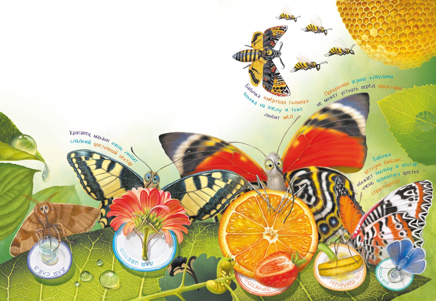 Что-то я проголодалась. Ну-ка, что у меня сегодня на обед? Цветочный нектар, сок деревьев, пчелиный мёд, пыльца и даже навоз. Ой, фу. Впрочем, мои подружки-бабочки считают его деликатесом. А на десерт, как всегда, гниющие, забродившие фрукты. Лапки оближешь! Из напитков: вода из луж и человеческий пот. М-м-м, как вкусно! Так что если я сяду тебе на руку, то это не потому, что ты напоминаешь цветок.
