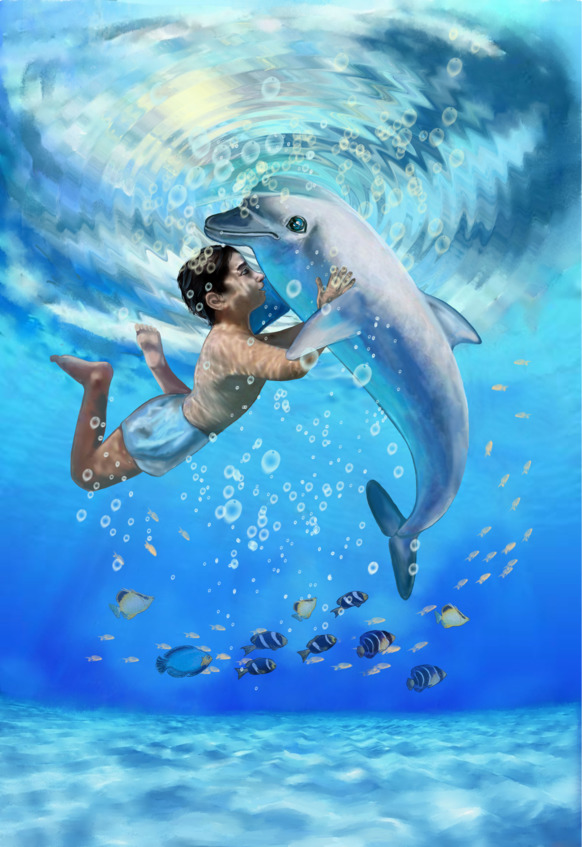Вдруг рядом с ним послышался сильный шум и крики. Фанни поплыл в ту сторону и увидел тонущее существо. Дельфиненок захотел помочь и стал толкать человека в сторону берега. Из последних сил Фанни доплыл вместе с ним до берега, где было уже не так глубоко. Человек смог встать на ноги и самостоятельно выйти на сушу. Люди на берегу, которые всё видели, стали радоваться и хлопать в ладоши. Тогда наш малыш решил подплыть к ним поближе. А дети сами подходили к Фанни и угощали его мелкой рыбкой. В эту секунду наш герой почувствовал, что стал счастлив, спася жизнь тонувшего и познакомившись с людьми.