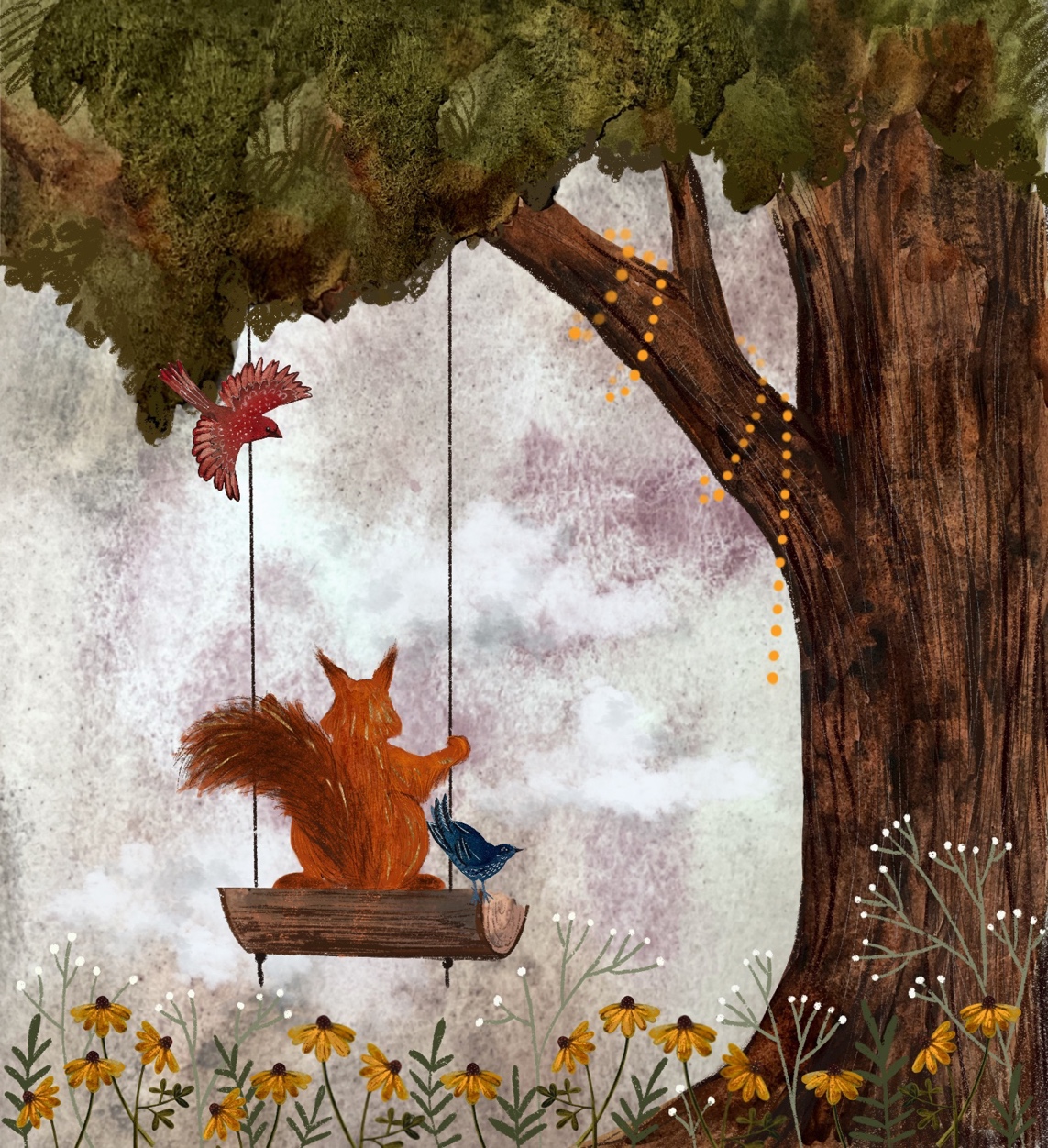 Наверное, Бельчонок уже подружился с Медвежонком и прямо сейчас они бегут к большому дубу, чтобы покачаться на качелях. Медвежонок очень сильный. Наверняка он раскачивает Бельчонка так, что тот достает лапками до самых облаков и смеется, когда они щекочут ему пятки.
