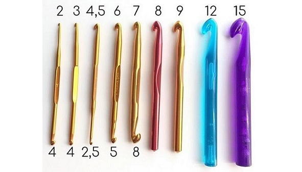 Крючок, как правило, подбираем под пряжу, смотрим рекомендованный производителем размер (указывается на этикетке). Дополнительно рекомендую иметь крючки на 1—2 размера меньше для отдельных этапов вязания (например, соединительные петли рекомендую делать крючком поменьше).