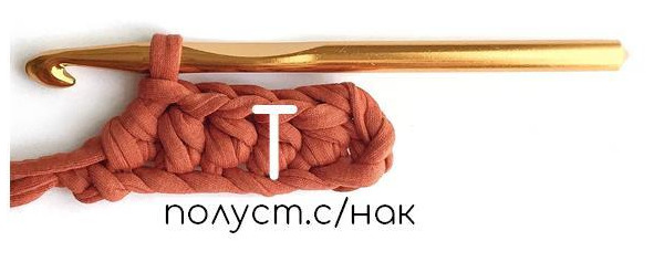 Полустолбик с накидом – делаем накид на крючок (накидываем рабочую нить на крючок), вводим крючок в петлю основания, захватываем рабочую нить – протаскиваем, на крючке – 3 петли, опять захватываем рабочую нить и провязываем все три петли на крючке сразу.