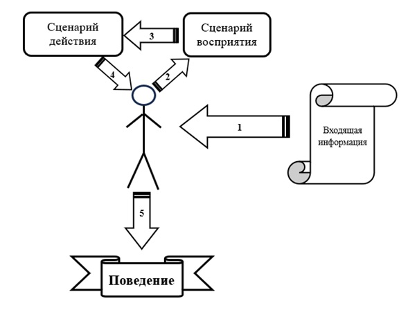А всё потому, что любую информацию, которую мы получаем – будь это слова, новости и даже мимика другого человека – всё это пропускается через систему сценариев. Сначала – через сценарии восприятия, где мы определяем (каждый по-разному), что значит эта информация. Потом она переходит в блок Сценариев действия. Тут мы решаем, что с этим делать (опять же, способы решения разные). И уже после этого действуем. И результаты действий нам либо нравятся, либо нет.
