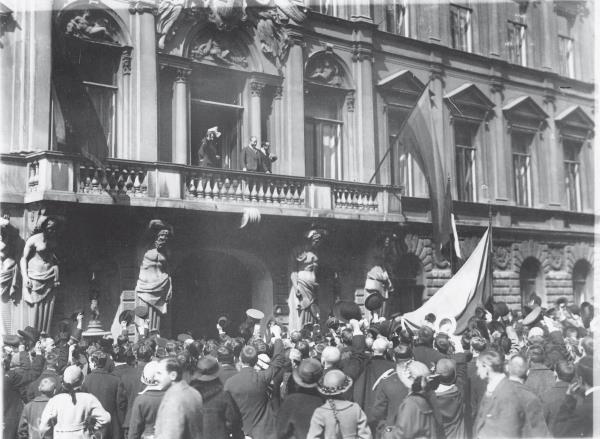 Итальянский посол и члены посольства приветствуют толпу народа, собравшуюся перед посольством (Морская ул., 43) по случаю объявления Италией войны Австро-Венгрии. 27 августа 1916 г. (ЦГАКФФД СПб)