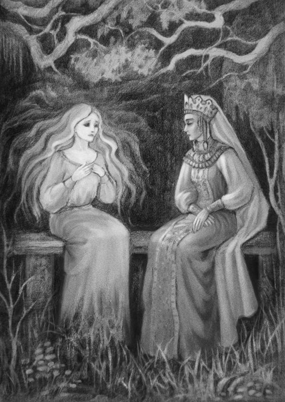 Василиса вздохнула и шагнула в тень. Тьма, клубившаяся над скамьёй, перестала быть тьмой: подле дуба сидела дева с бледной кожей и белыми как снег волосами. Её белое траурное платье таяло в траве, будто туман. Её пустые глаза были чёрными, как ночь.