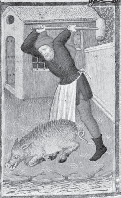 Забой домашней свиньи. Миниатюра из «Часослова Бедфорда», Франция, 1414–1423 гг.