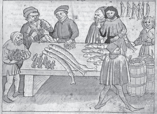 Рыбный рынок. Миниатюра Ульриха фон Рихенталя из «Хроники Констанцского собора», Германия, первая половина XV века