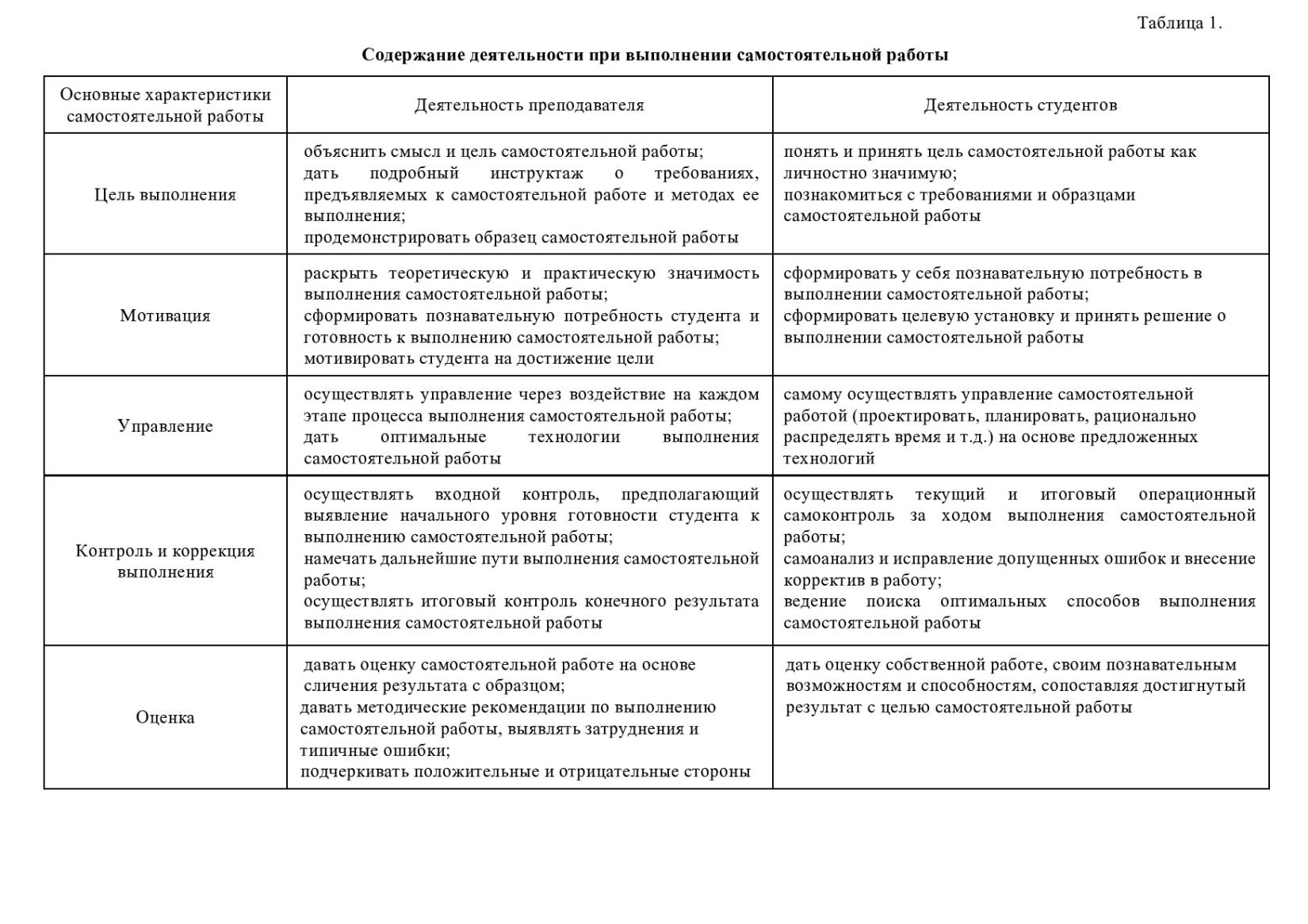 Сущность и основные характеристики самостоятельной работы определяются содержанием совместной деятельности как преподавателя, так и самого студента (табл. 1).