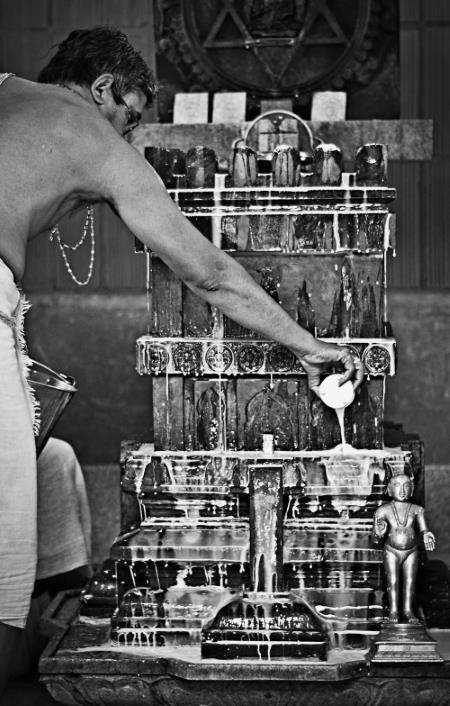 С собой люди обычно приносят фрукты и цветы, чтобы предложить их божеству. Чаще всего это кокосовый орех, банан, бетель, цветочные гирлянды и деньги. Но сначала все это нужно вручить жрецу – он сам предложит дар. Если был принесен кокос, то помощник жреца разбивает его о специальный острый камень и затем складывает обе половинки на большой медный поднос, который держит жрец и на котором размещены дары. Жрец проходит к алтарю в маленькую темную комнатку через небольшой дверной проем. Здесь установлено изображение главного божества в виде мурти или в виде черного каменного лингама – если это шиваитский храм.