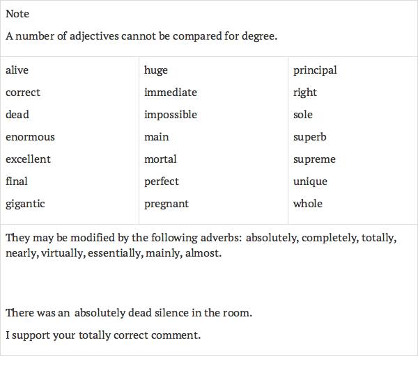 a dreadfully dull day, extremely hot weather, a fairly large message, a hugely important signal, an immenselyfamous picture, incredibly useful advice, an intensely busy street, a little/a bit expensive ring, a rather good attitude, a reasonably weak accent, quite an interesting list, a slightly somber event, a too jealous husband, an unusually clever dog, very young people