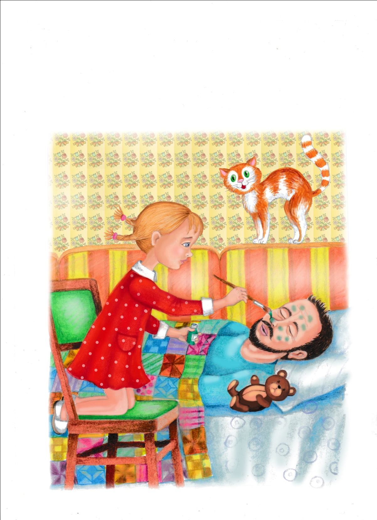 Он даже не почувствовал лечения. Маришка отошла в сторону и полюбовалась своей работой. Ну вот, совсем другое дело! Зелёный нос и веснушки-горошинки превратили папу из несчастной лошадки в забавного клоуна. Маришка аккуратно закрыла пузырёк, затем устроилась на диване, в ногах папы и стала терпеливо ждать, когда тот проснётся, и они начнут играть в весёлых клоунов.