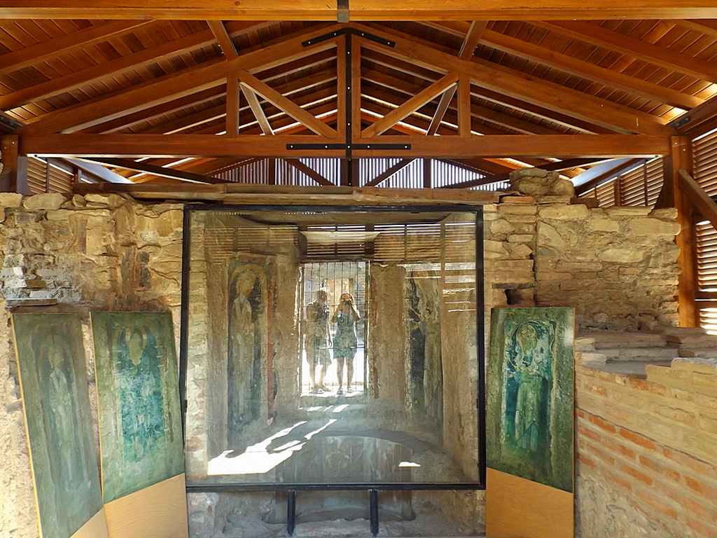 А еще здесь была построена часовня, которая подарила нам в коллекцию замечательное фото. Она закрыта, но через стекло видны фрески, которые я пыталась сфотографировать. Получилась мистическая картинка.