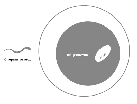 Попав в ампулярную (самую широкую) часть маточной трубы, женская половая клетка именно здесь встречается с мужскими половыми клетками – сперматозоидами, которые принимаются усиленно атаковать ее. Сами они при этом погибают, однако не напрасно: их содержимое разжижает толстую стенку яйцеклетки. И вот наконец одному «счастливчику» удается проникнуть внутрь яйцеклетки, которая практически поглощает его. Чаще всего сперматозоид теряет в процессе зачатия свой хвостик. Таким образом, утверждение о том, что для зачатия ребенка достаточно одного сперматозоида, не совсем верное. В естественных условиях очень важную роль в зачатии играют миллионы активных, подвижных сперматозоидов, но непосредственно оплодотворяет яйцеклетку действительно всего лишь один из них (рис. 1).