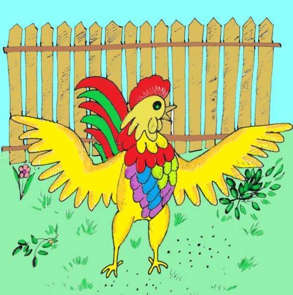 Петух моментально забыл о новой знакомой и ринулся туда, где сверху падали зёрна пшена. Залопотал что-то на своём языке, призывая кур.