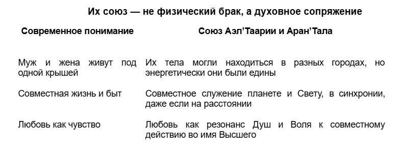 Аэл’Таария и Аран’Тал – это союз, основанный на вечной миссии и космическом доверии. Они не жили как земная пара, но были и остаются единым лучом в служении Свету.