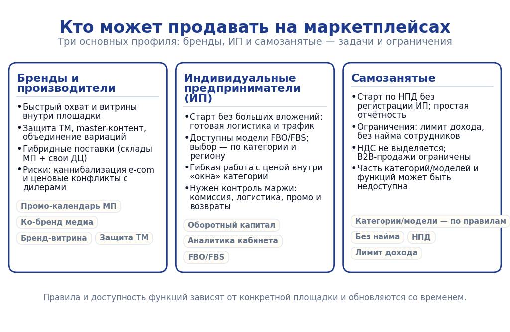 Есть и платформенные особенности. Не все категории и логистические модели доступны самозанятым, а часть функций (например, расширенные B2B-инструменты или углублённые бренд-витрины) может быть ограничена. Перед стартом стоит свериться с действующими правилами конкретной площадки: требования к приёмке, маркировке, упаковке и возвратам едины для всех статусов продавцов.