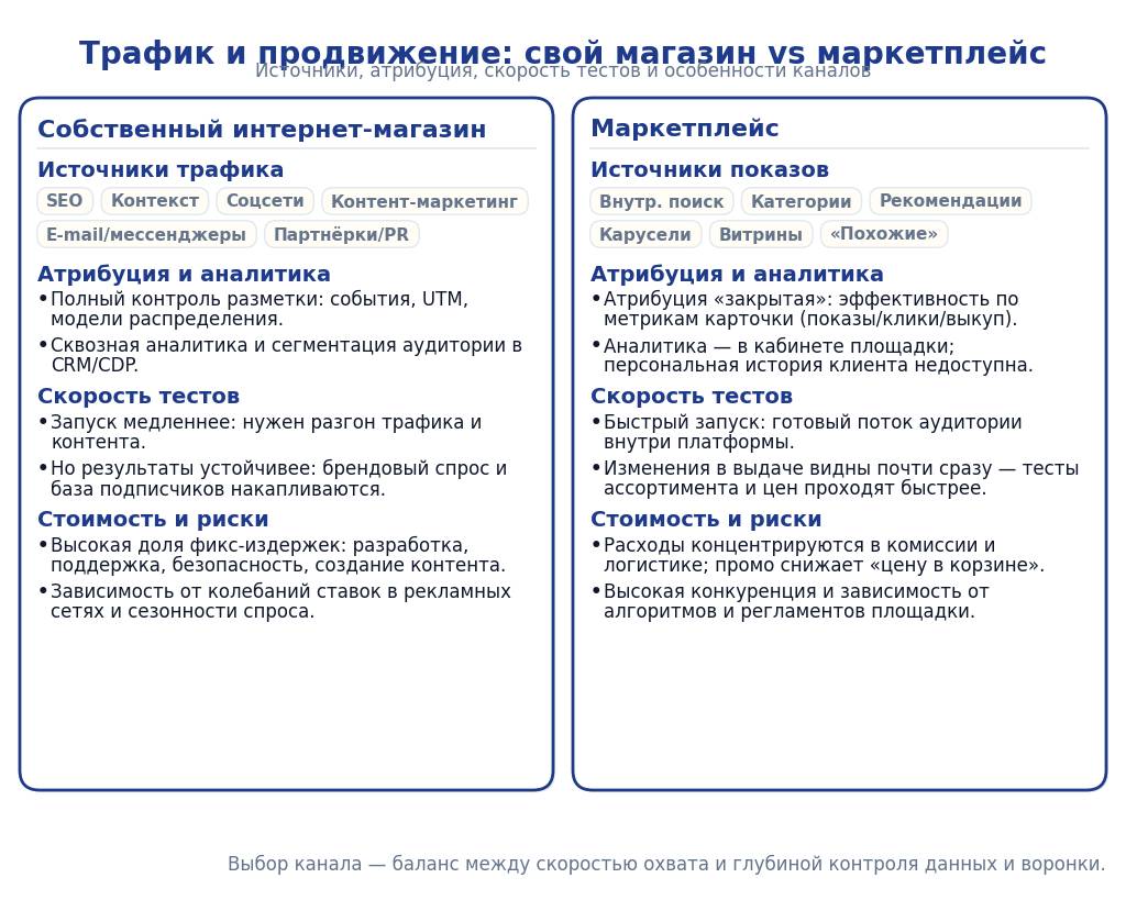 Маркетплейс приносит готовую аудиторию и быстрые тесты, но продвижение и отчётность живут в рамках платформы. Выбор – это баланс между скоростью охвата и глубиной контроля.