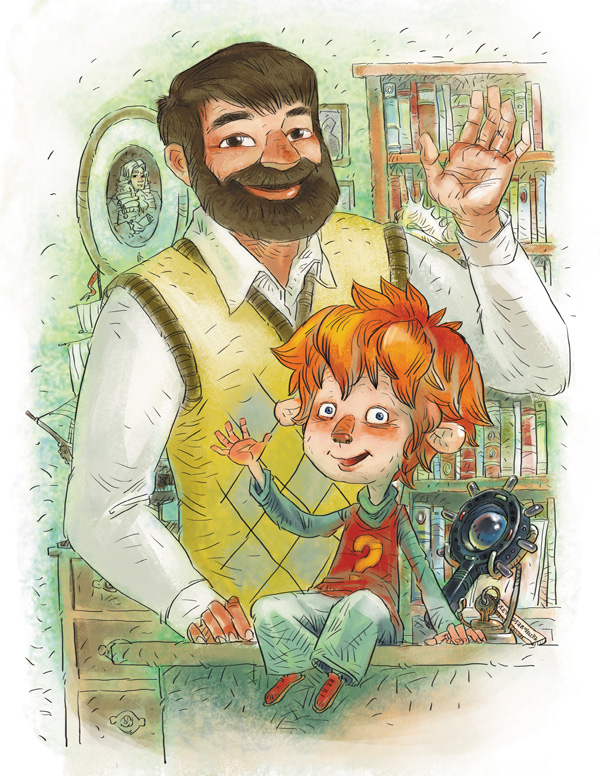 Здравствуйте, ребята! Меня зовут Чевостик. Я живу на книжной полке в библиотеке у дяди Кузи. Не удивляйтесь, я небольшого роста, а нижняя полка в книжном шкафу дяди Кузи очень высокая и просторная, поэтому мне на ней хорошо и удобно. Какой я? Похож на обыкновенного мальчишку, волосы рыжие, характер весёлый. Дядя Кузя в шутку зовёт меня Чевочка с хвостиком. Но никакого хвоста у меня нет, зато есть ушки на макушке. Больше всего на свете я люблю узнавать новое, поэтому всё время задаю всякие вопросы дяде Кузе. О чём бы я ни спросил, он всё знает и мне рассказывает. Это потому, что дядя Кузя очень умный. Он прочитал много-много разных книг. А ещё мы с ним любим путешествовать! В путешествиях нам помогает времяскок. Это такой прибор, его дядя Кузя изобрёл. Набираешь на времяскоке место и время, куда хочешь попасть, раз, два – и уже там! Сегодня мы наверняка тоже куда-нибудь отправимся!