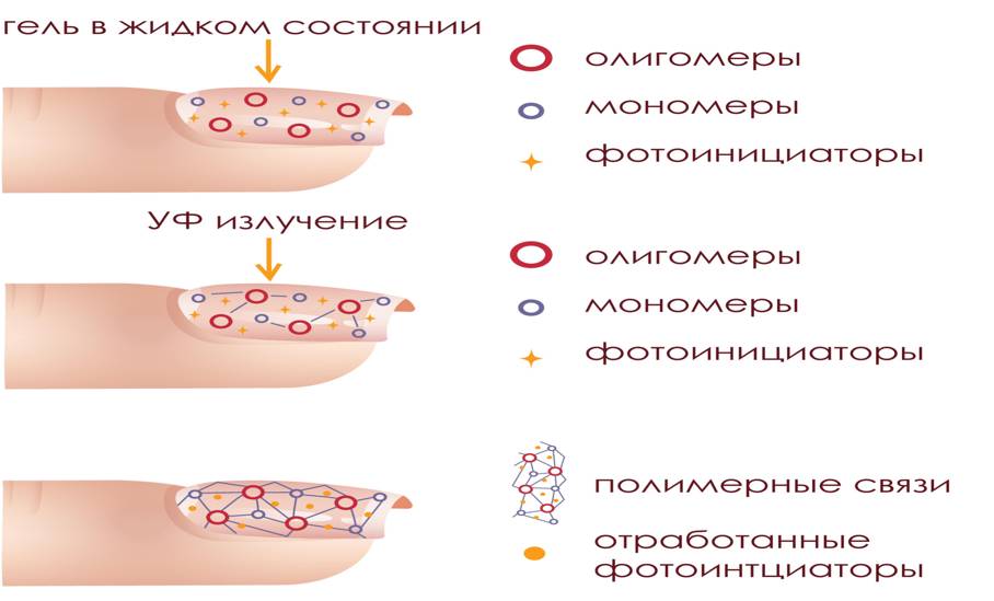 Первый – те, у которых образование полимера начинается при световом облучении (ультрафиолетовое излучение). Это все виды гелей.