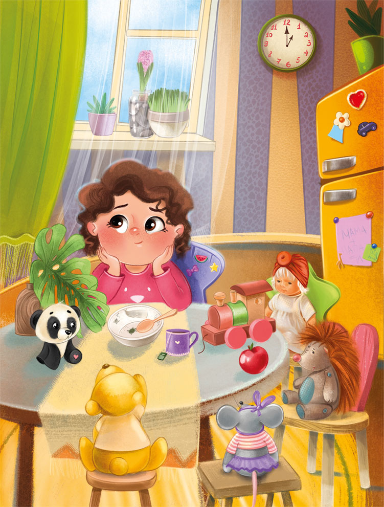 Знакомьтесь – Кристина,Малышка двух лет,Сидит за столом,Ожидая обед.Лопочет онаНа своём языкеИ очень разборчиваВ детской еде.Любимые книжкиНа полке стоят,В игрушечном домесобачки лежат.И сложены кубики, звериВ большущей коробкеУ двери.А также коляскиИ куклы-подружки,Мячи и медведи –Кристины игрушки.