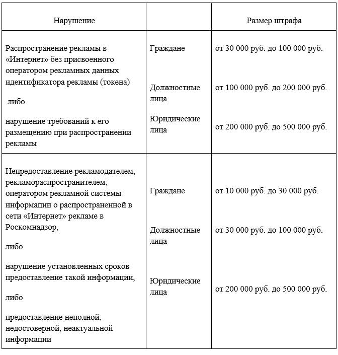 2. Штрафы за нарушение требований по маркировке рекламы