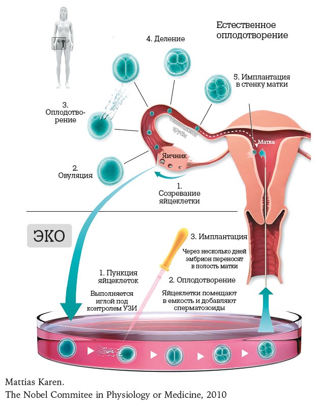 ЭКО применяется, когда сперматозоид и яйцеклетка не могут встретиться в естественных условиях. Врачи и эмбриологи организовывают оплодотворение in vitro, и эмбрион попадает в матку с другого входа: не через маточную трубу, а через влагалище и шейку. А в остальном это точно такой же эмбрион, какой получился бы естественным путем. Процессы естественного оплодотворения и ЭКО показаны на рис. 2.