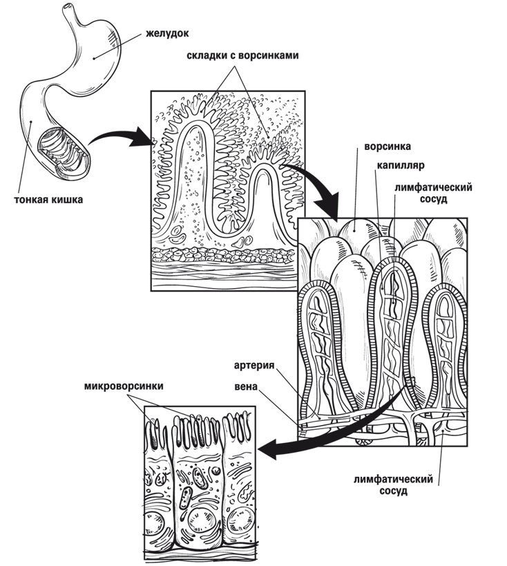 Итак, питательные вещества распались до самых маленьких молекул и начали всасываться, чтобы в итоге добраться до пункта своего назначения – клетки. Поверхность тонкой кишки, которая занимается транспортом молекул, образует выросты – ворсинки, которые расположены довольно плотно друг к другу, так что кишка выглядит изнутри бархатистой. В каждой ворсинке собственная система сосудов – артериальный, венозный и лимфатический капилляры. Ворсинки образуют складки и имеют дополнительные выросты – микроворсинки. Это обеспечивает гигантскую площадь всасывания (величиной с теннисный корт) и эффективную работу системы (рис. 1.3).