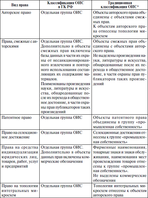 Сравнение классификации ОИС в Гражданском кодексе Российской Федерации с традиционной классификацией
