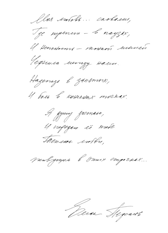Я очень хочу,Чтоб тыМне позвонил,Засмеялся,И шепотом низкимРадугу сделал,Спросил,Тихо слушал,Потом перебил,И был таким искренним,И таким смелым.Хочу с тобой слушатьКолокола,Видеть музыку ночи,И как птицы летают,Смотреть, как по коже мнеПишешь слова,Молитвы, скрижали,А я их читаю.Я очень хочуОпуститься с тобойТуда, где даже ужеНе стоят на коленях —Где можно дышатьИли всей глубинойИли вместе пропастьВ бесконечных вселенных.Меня в тебе манитИ цвет, и простор,И сердце, и ещёНеожиданно нежныйО самом серьезномНаш разговор,И струна между нами,Ноты «надежда».Звони, дорогой,Я буду ждать,Не важно когда,Из дому или с вокзала.Ты ведь не сможешьКо мне опоздать:У нас с тобой вечность,Хотя этого… мало.