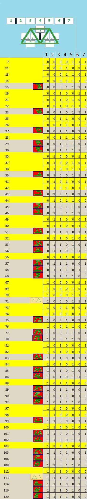 Постепенно родилась схема перевода рун в двоичный код за счёт того, что проявленные резы каждой руны прописывались как 1, а резы непроявленные (дополнение) – 0. И резы для начала я пронумеровала слева-направо: