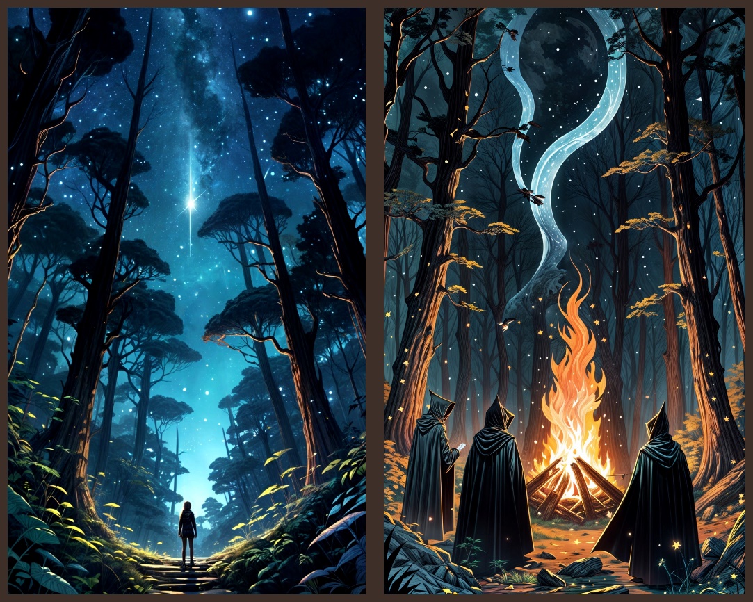 На вторую ночь она вернулась в лес. Она оделась красиво, распустила свои мягкие волосы, подвела мягкие линии глаз. Волшебники встретили её с удивлением. Они сидели вокруг костра, по краю сгущающейся в лесу темноты, и недоумённо оглядывали внезапно появившуюся среди их тусклого общества барышню. Навстречу ей поднялся тот, кого она встретила первым, и кто обещал ей помощь.