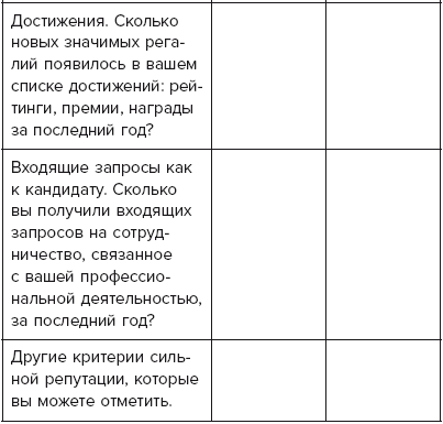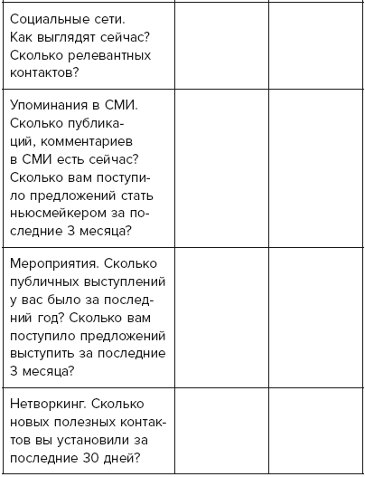 Для этого заполните таблицу «Аудит персонального бренда». Оцените ваш персональный бренд по критериям, определите текущее состояние (вторая колонка), а также желаемое – в соответствии с вашей целью (третья колонка). Третья колонка станет планом ваших действий.