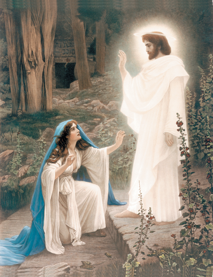 Мария Магдалина преклоняет колени перед владыкой Иисусом, сияющим лучезарным светом воскресения. Его аура была настолько сильной, что многие люди исцелялись, просто прикоснувшись к краю его одеяния. Мария первая ощутила силу ауры Иисуса, когда он изгнал из неё семь демонов одержания.