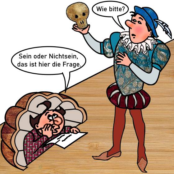 1. «У нас гости (Besuch haben), бабушка». – «Как ты сказала? Что у нас?» – «Здесь господин и госпожа Шмидт». – «Ах вот как». 2. «У него свинка (der Ziegenpeter)». – «Как ты сказала? Что у него? Коза по имени Петер?» – «Да нет же. У него свинка. Он болен». – «Ах вот оно что». 3. «Тетя Эмма придет послезавтра». – «Как ты сказала? Когда она придет?» – «Послезавтра». – «Слава Богу. Мне показалось (здесь: denken), ты сказала, уже завтра». 4. Лектор: «Через семь миллиардов лет солнце совсем остынет». Студент: «Как вы сказали? Когда солнце остынет?» Лектор: «Через семь миллиардов лет». Студент: «Слава Богу! Мне показалось, вы сказали через семь миллионов лет». 5. «Мой дядя – нумизмат (der Numismatiker)». – «Как ты сказал? Кто он?» – «Нумизмат. Он собирает (sammeln) монеты (die Münze, мн. ч. die Münzen)». – «Ах вот как. Раньше говорили просто нищий (der Bettler)». 6. «Она ездит на танке для домохозяек (der Hausfrauenpanzer – шутливое название внедорожника)». – «Прости, на чем?» – «На джипе (der Jeep)». – «Ах вот как». 7. «Мой дядя – пластический хирург (der plastische Chirurg)». – «Как ты сказала? Кто он?» – «Пластический хирург». – «Ах вот как! Разглаживатель морщин (der Faltenbügler – шутливое обозначение пластического хирурга)».