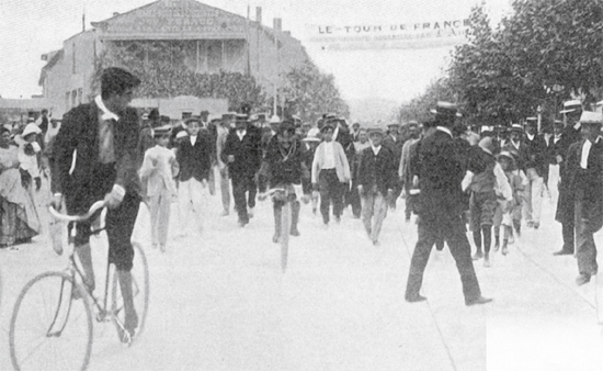Riders make their way from Lyon to Marseille during stage 2 of the first Tour de France. Only twenty-one competitors would complete the race, covering 2428 km (1509 miles) in six days.