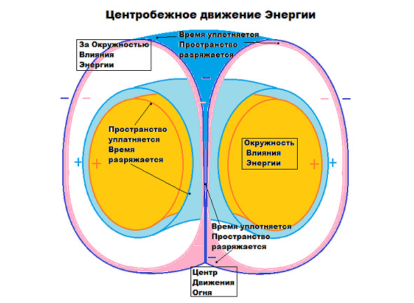 12. During the centrifugal movement of energy, Matter (Space) is discharged, and the density of Time is pumped up in the Center of Fire Movement. In the Circle of Influence of Energy in this case the Matter (Space) is condensed, and the density of Time is discharged; beyond the Circumference of Influence of Energy, Matter (Space) is discharged, and the density of Time is pumped up.”