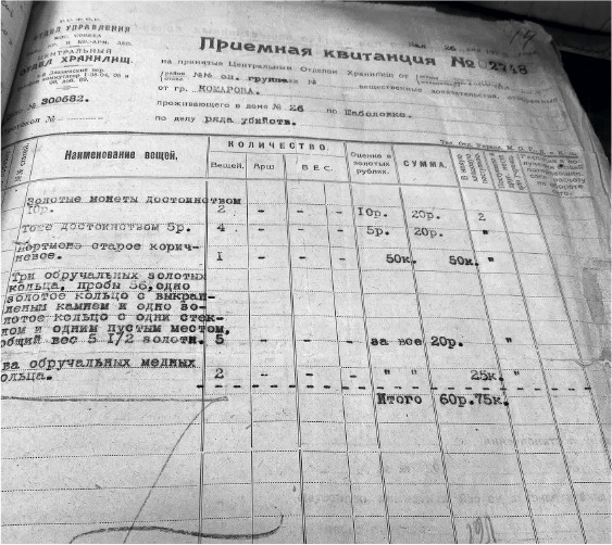 Есть в деле приемные квитанции, где перечислено все изъятое у Комарова имущество: золотые монеты, четыре обручальных кольца золотых, два обручальных кольца медных, аннулированные кредитные билеты, дензнаки, серебряная цепочка, бронзовая медаль большая, а также много мужского белья. Отдельно указано, что у него конфискованы и переданы Моссовету лошадь, корова, поросенок, сбруя, легковые сани.