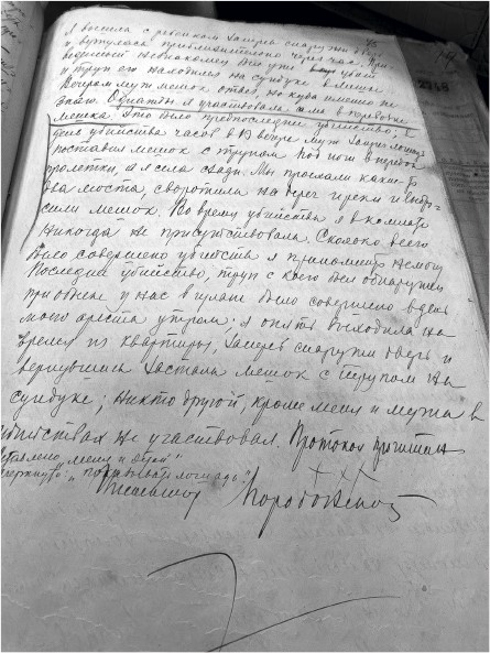 По распоряжению начальника спецгруппы отправился вчера в Замоскворецкий районный Сенат, и тов. С. выдал ордер на право о производстве обыска у гр-на Комарова на предмет обнаружения краденого/трупов. Взяв с собой участкового надзирателя и милиционера, отправился на Шаболовку, дом № 26, где вызвал преддомкома и говорил с ним о причине отсутствия освещения у ворот дома прошлой ночью и собирал сведения о Комарове (дома ли он). Поднявшись по лестнице на второй этаж со старшим помощником и председателем, оставив двух милиционеров на улице, увидели, что подозреваемый Комаров и его жена дома. Я с участковым надзирателем стал производить обыск в комнате Комарова, причем показалось подозрительным, что были найдены несколько зажигалок и бумажников. Кончив обыск в комнате, стал производить обыск в проходном коридоре, посадив подозреваемого около забитого жестью окна под надзором помощника 4-го отделения милиции, и заинтересовался чуланчиком. Спросив, где ключ, получил ответ, что чуланчик общий и ключ находится в нижней квартире. Не желая посылать милиционера вниз, боясь существования сообщников Комарова, решил с председателем пойти сам. Не успел ступить на первую ступень лестницы, услыхал звук чего-то падающего. Я бросился обратно и увидел, что задержанного нет, и выскочил за ним на улицу. Он бросился в сад за углом, так что я вследствие темноты не мог его заметить и, поискав его по улицам, вернулся в комнату. Затем поднял тревогу, сообщив начальнику о побеге Комарова, и сбил замок с чулана, обнаружил в мешке труп.