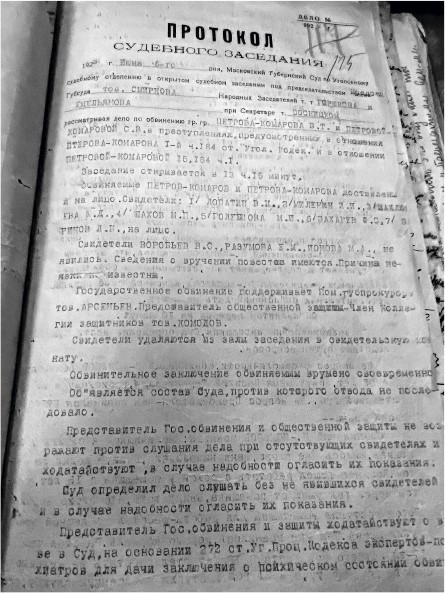 Следствие завершили в рекордные 11 дней (с 18 по 29 мая), и дело передали в суд. Передо мной протокол судебного заседания от 6 июня 1923 г. с председательствующим Смирновым и двумя народными заседателями. В документе указано, что гособвинитель (прокурор) попросил о присутствии на процессе эксперта-психиатра. То есть до суда экспертиза не была проведена.
