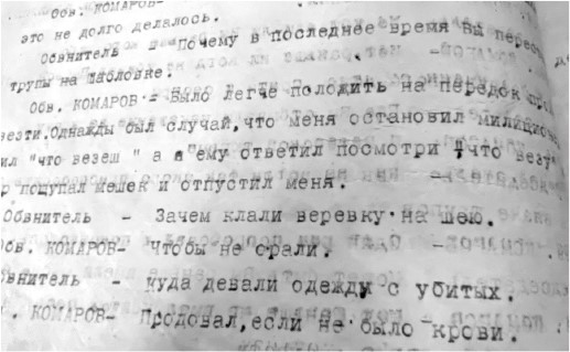 Пока одни милиционеры бросились в погоню, другие стали допрашивать жену Комарова. По этому поводу есть интересная запись: «Дети заплакали и просили ее рассказать, что она и обещала сделать». У Комарова было трое малолетних детей: две девочки и один мальчик. Судя по всему, они догадывались, чем занимается их отец. Возможно, что в какой-то момент даже были свидетелями кровавых преступлений. Но следствие не стало тревожить детей – в деле нет ни одного протокола их допроса. Вероятно, сделали это потому, что доказательств и так было предостаточно.