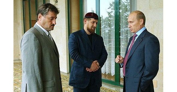 Владимир Путин с главой Общественного совета по контролю за восстановлением экономики и социальной сферы Чеченской Республики Алу Алхановым и первым заместителем председателя правительства Чеченской Республики Рамзаном Кадыровым, 2004.