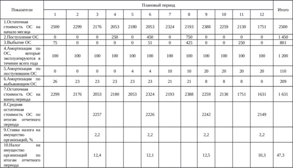 Средняя остаточная стоимость основных средств определена как среднеарифметическое её величины на начало и конец месяца. Например, в первый месяц средняя остаточная стоимость основных средств составит 2 400 тыс.руб. ((2 500+2 299) /2=2 400).