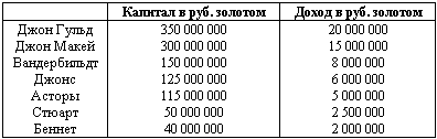 Французу Максу Орелю, сообщившему эти цифры, они кажутся поразительными. “Вот каковы, – восклицает он, – эти князья страны долларов! Богатейшие английские состояния не составляют таких сумм. Действительно, состояние герцога Вестминстерского достигает только 100 млн. руб. золотом, а он богаче всех в Англии; состояние герцога Сутерлэндского не превышает 40 млн. руб. золотом, Нортумберлэндского – 30 млн. руб. золотом, а маркиза Бьюта – 25 млн. руб. золотом”.