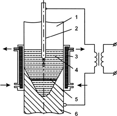 После накопления определенного количества жидкого шлака дуга шунтируется шлаком и гаснет, а подача проволоки и подвод тока продолжаются. При прохождении тока через расплавленный шлак, являющийся токопроводящим электролитом, в нем выделяется теплота, достаточная для поддержания высокой температуры шлака – до 2000 °C и расплавления основного металла и электродной проволоки. За счет разницы в плотности электродный металл (плотность жидкого металла значительно больше плотности компонентов шлака) опускается на дно расплава, образуя металлическую ванну (5), а расплавленный флюс находится в верхней части расплава, образуя шлаковую ванну (4).