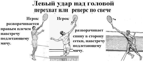 1. Удар «Реверс-перехват». Это удар над головой по левому мячу на высоте вытянутой вверх руки с ракеткой с места или в прыжке. Удары «реверс – перехват» выполняются:
