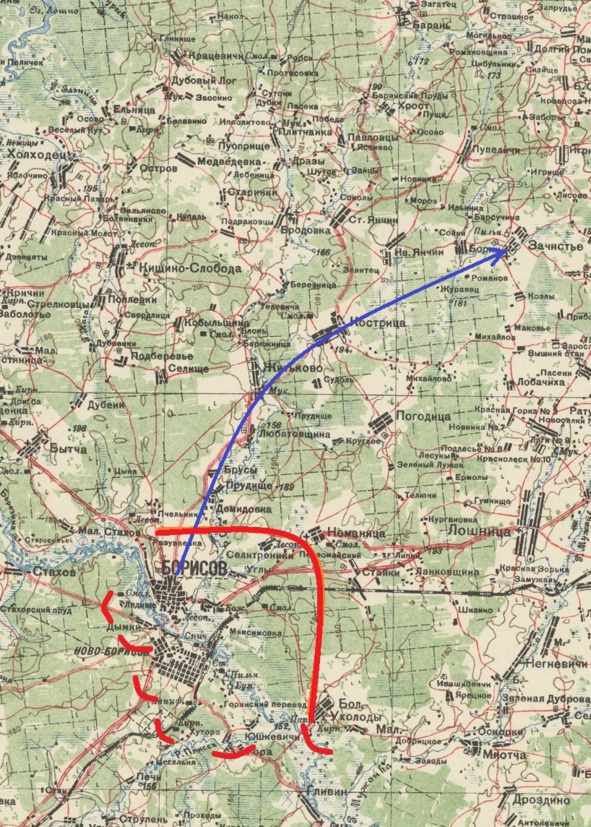 Как это видно из донесения начальника Борисовского гарнизона командованию фронта от 29 июня, этими незначительными силами Сусайков попытался удержать переправы через Березину (совхоз Веселово и д. Черневка), прикрывая основными своими силами Борисов от южной окраины города в направлении деревень Дымки, Баранцы и Большие Ухолоды15.