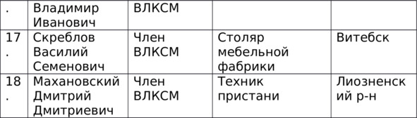 Естественно, уровень подготовки спешно создаваемых в Лиозно групп не мог быть удовлетворительным. Так, например, группа Яроша была сформирована в исключительно из гражданских лиц. Помимо самого Яроша в нее вошло еще несколько партийных и советских функционеров довоенного Борисова: уже упомянутый нами председатель райисполкома Константин Иванович Акулич, председатель горисполкома Иосиф Максимович Кудинович, прокурор Борисовского района Антон Герасимович Ходаркевич, директор дома отдыха Блонь Соломон Абрамович Ласкин, а также несколько комсомольцев из Витебской области, в основном – работников трамвайного депо Витебска и уроженцев Лиозненсого района20. Всего на момент организации в группу входило 18 человек. Упоминаемые в книге Памяти Крупского района 1-й секретарь Холопеничского РК КП (б) (в будущем) И. Т. Ламинский и секретарь Холопеничского райкома комсомола Екатерина Трипутень21 в списке группы Яроша не значатся, они присоединятся к ней позднее, уже на оккупированной территории, о чем говорится и в «официальной» части воспоминаний Константина Акулича22