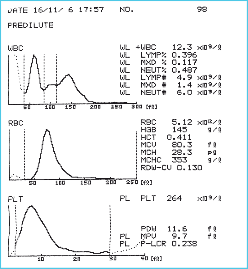 Гематологический анализатор – сложный, удобный, высокопроизводительный и не очень дешевый прибор. Он заправляется разнообразными реактивами, подключается к электрической сети. Внутрь помещается пробирка с капелькой крови, и через минуту аппарат выдает результат в виде бланка, примерно такого, как показано на рисунке. Точно и быстро анализатор определяет уровень гемоглобина и гематокрит, выдает информацию о форме, размерах и количестве эритроцитов, ретикулоцитов, лейкоцитов, тромбоцитов, рисует графики, отражающие частоту встречаемости форменных элементов и их распределение в зависимости от размеров, объема и т. п.