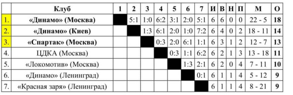 – Чемпион – «Динамо» (Москва): А. Квасников (вратарь (далее – в), принял участие в 5 матчах), Е. Фокин (в, 2), Л. Корчебоков (5), В. Тетерин (5), П. Коротков (4), А. Лапшин (5), Е. Елисеев (6), А. Ремин (6), В. Дубинин (1), М. Семичастный (6, забил 6 голов), М. Якушин (5, 1), В. Смирнов (6, 5), В. Павлов (6, 5), С. Ильин (6, 4), А. Пономарёв (1). Старший тренер – К.П.Квашнин.